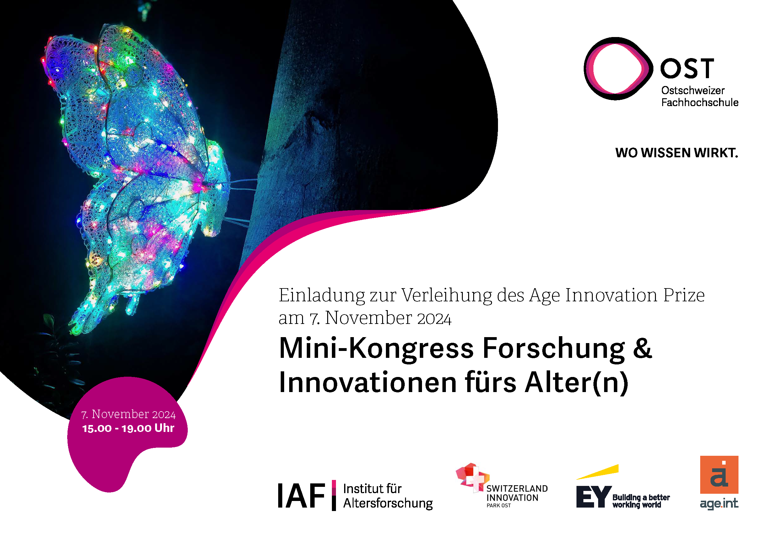 Mit der Verleihung des Age Innovation Prize tragen wir vom IAF Institut für Altersforschung der OST – Ostschweizer Fachhochschule im Rahmen des nationalen AGE-INT Programms dazu bei, innovatives Arbeiten in unserem Land zu fördern. Der Preis würdigt in diesem Jahr bereits zum zweiten Mal technikbegeisterte Unternehmen und innovative Denkerinnen und Denker, die das Leben älterer Menschen mit innovativen Alterstechnologien verbessern wollen. Lassen Sie sich inspirieren von den spannenden Reden von Prof. Dr. Guido Schuster, Experte Künstliche Intelligenz und Ostschweizer Digital Shaper und PD Dr. Thomas Münzer, Chefarzt Geriatrische Klinik St. Gallen und Altersmediziner, rundum die Themen Alter, Technologien, Künstliche Intelligenz und Prävention sowie den Präsentationen der Gewinnerteams. Bereits nach Ihrem Eintreffen sowie beim Apéro riche im Anschluss an die Preisverleihung bietet eine Ausstellung Gelegenheit zum Austausch. An spannenden Ständen der Gewinnerteams und des AGE-INT-Netzwerks können Sie ins Gespräch kommen. Lassen Sie sich dabei die Ideen, Erfindungen und Forschungsresultate näherbringen. 📅 Donnerstag, 7. November 2024 ab 15.00 bis 19.00 Uhr 📍 am Switzerland Innovationspark Ost in St.Gallen