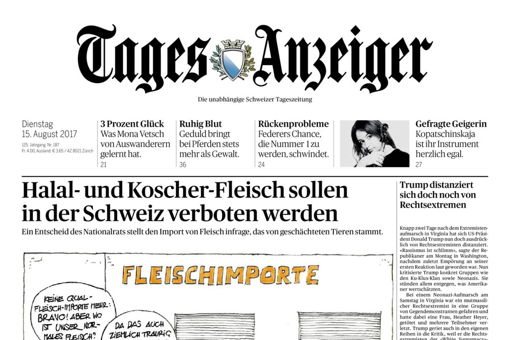 Die Schächtdebatte: Selbst in der Gegenwart virulent. Frontaufmacher des Tagesanzeigers am 15. August 2017.