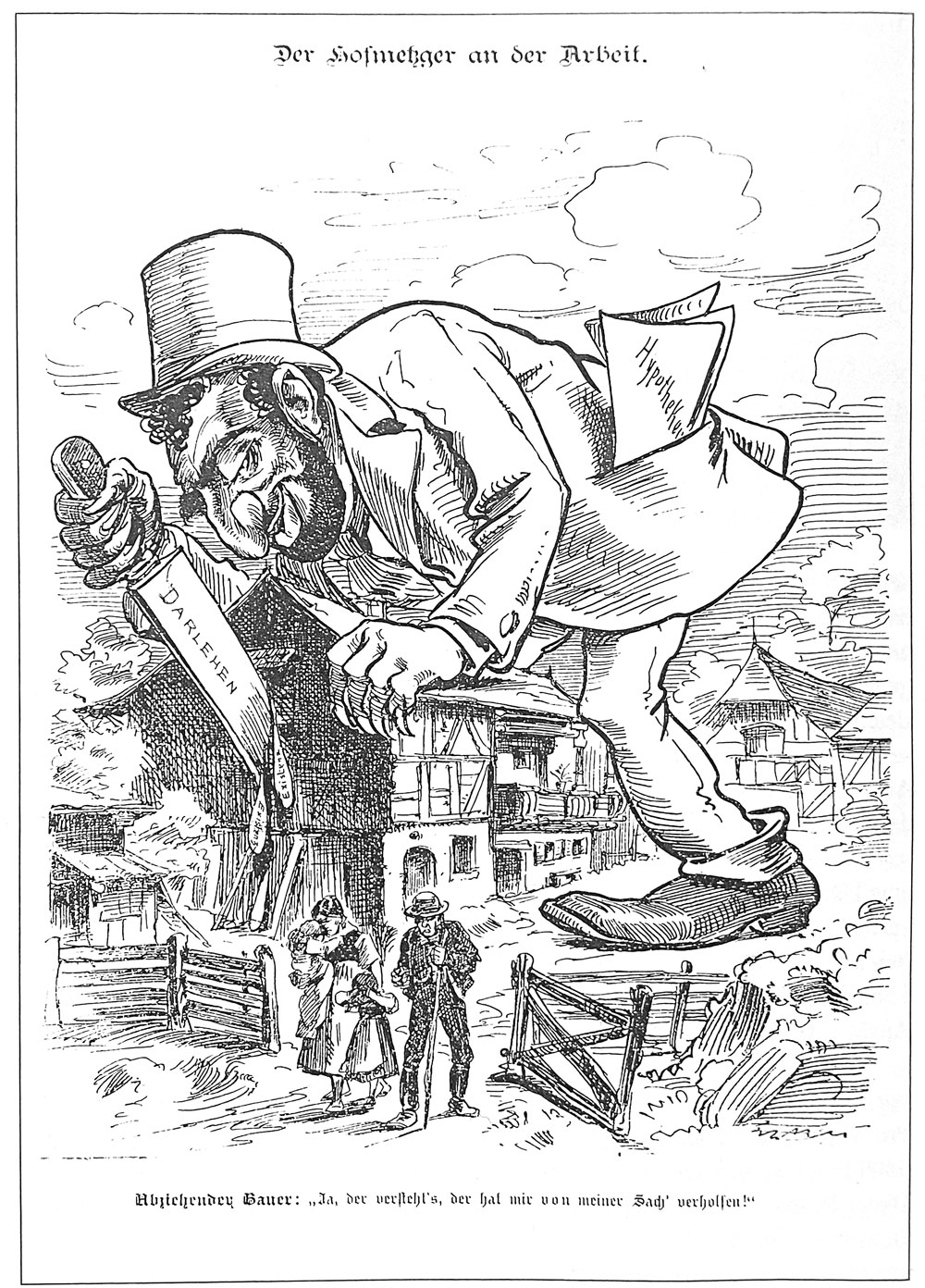 Der Hofmetzger – sprich: der jüdische Viehhändler – stürzt die Bauern in die Krise. Nebelspalter-Karikatur aus dem Sommer 1893. | Bild: Nebelspalter