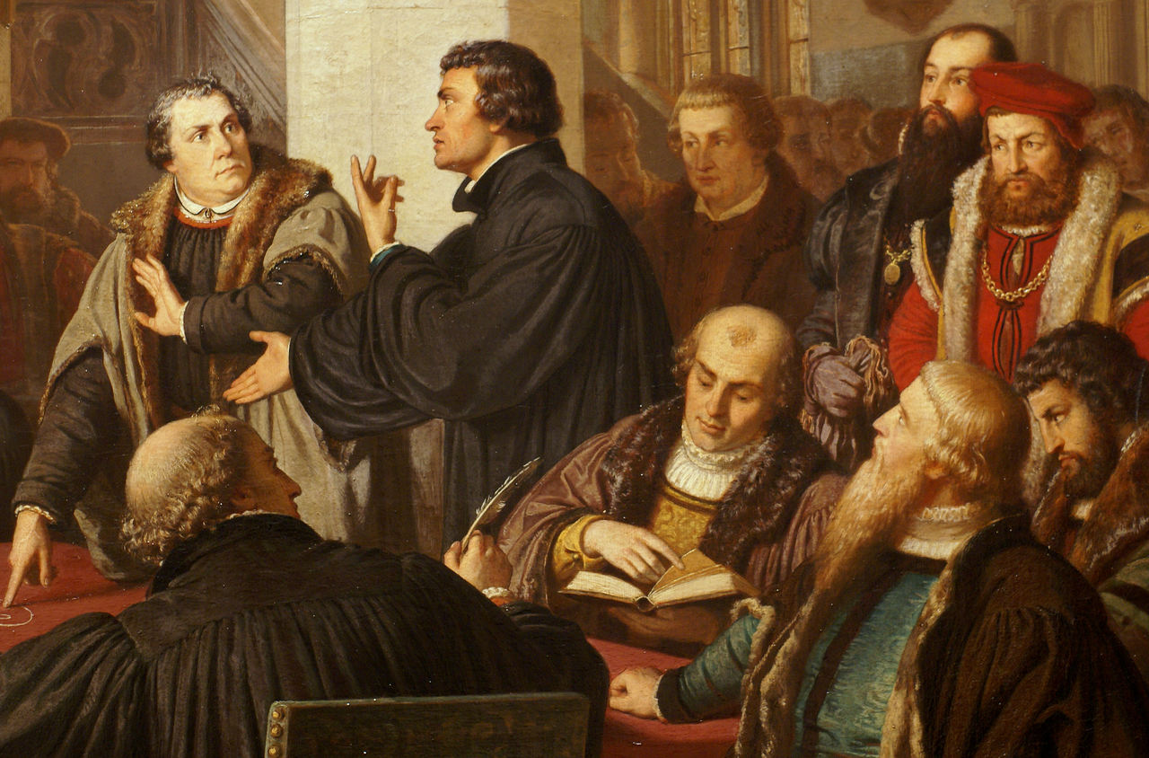 Luther und Zwingli trafen sich mit ihren Delegationen 1529 in Marburg, um ihre Differenzen zu bereinigen. Das gelang in allen Punkten – ausser in der Frage vom Abendmahl. Gemälde von August Noack, 1867.