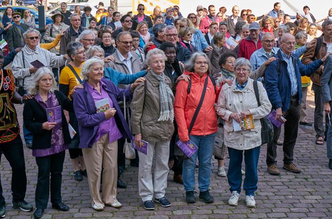 «Wo ist dein Bruder, wo ist deine Schwester?» Gemeinsam mit den Vertretern der Schwesterkirchen aus dem Elsass und Badischen eröffnete Martin Stingelin, Kirchenratspräsident der Reformierten Kirche Baselland, in Mulhouse den 5. Kirchentag am Rheinknie. Mit ihrer Eingangsfrage setzten sie das Thema: Geschwisterlichkeit über die konfessionellen, staatlichen und sprachlichen Grenzen hinweg. Mehrere Hundert Besucherinnen und Besucher fanden bereits am Vormittag den Weg ins historische Zentrum der Stadt, die zwischen der katholischen Eglise Saint-Etienne und dem reformierten Temple Saint-Etienne mit der Place de la Réunion das Herz des Kirchentags bildete. Viele reisten aus der Region Basel und dem Markgräflerland an.