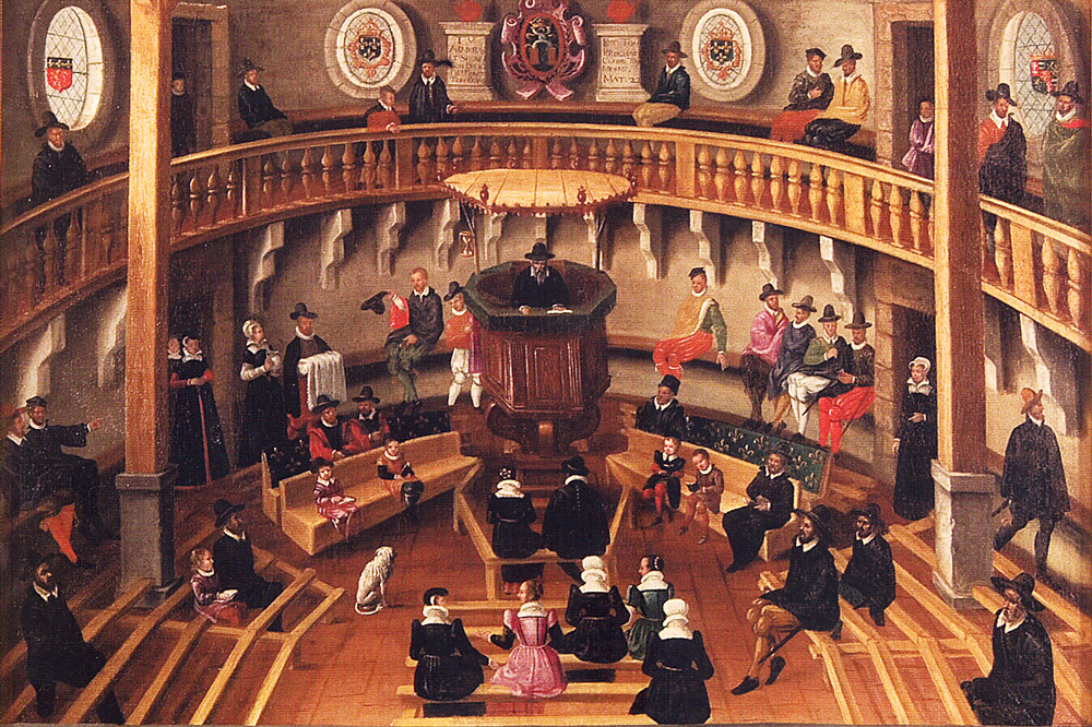 Das Gemälde «Temple de Lyon, nommé Paradis» von etwa 1570 zeigt, wie die Reformation die Kanzel in die Mitte der Kirche rückte, um die Predigt ins Zentrum zu stellen. | Bild: Wikimedia, gemeinfrei