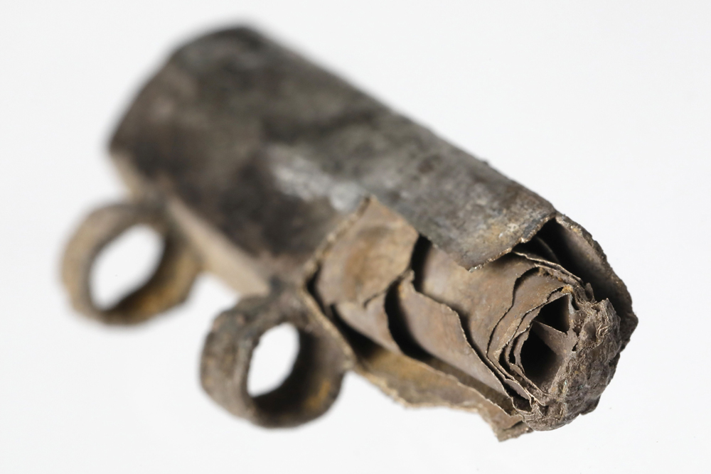 Im Archäologischen Museum wurde der Fund aufbereitet und restauriert. Schon bald wurde klar: Das Silberamulett ist nicht leer, sondern enthält eine Inschrift. | Foto: epd/Leibniz-Zentrum für Archäologie