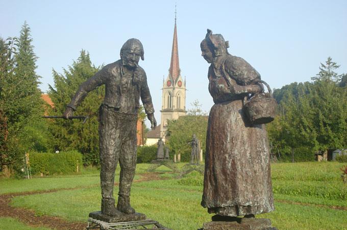 Das figürliche Gotthelf-Panoptikum auf der Wiese in Lützelflüh ist hier allerdings nicht mehr lange zu sehen. Aufgrund einer Erbschaft ist das Landstück in andere Hände übergegangen; die neue Besitzerin will es bis Mitte Jahr geräumt haben. Was den Schöpfer der Skulpturen schmerzt, denn: «Sie gehören hierher nach Lützelflüh, wo ihr geistiger Vater Gotthelf gewirkt hat.» Im Prinzip könnte er auch einen Einzelverkauf anstreben und die Figuren nach und nach in Privatbesitz übergehen lassen, aber: «Gerade die Figuren aus der Gotthelf-Serie sind weniger Kaufobjekte als Schauobjekte; sie gehören zusammen.» Zudem seien die Bronzen in einer Grösse modelliert, die selten in einen Garten passe, und auch die Preise lägen eher ausserhalb eines durchschnittlichen Budgets.