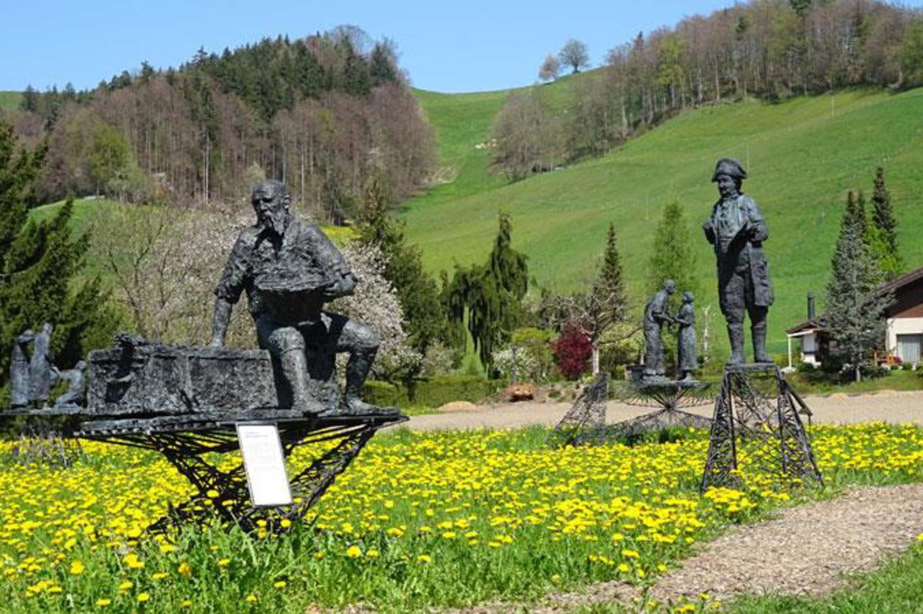 Manch einer verlässt diesen besonderen Skulpturenpark mit einem Lächeln auf den Lippen: Die Bronzefiguren bilden einen gemüt- und lebensvollen Kontrast zum eher vergeistigten Programm im benachbarten Gotthelfzentrum. Ihr Erschaffer ist der in Zürich lebende Künstler Freddy Air Röthlisberger (81). In den Figuren steckt viel Gotthelf, aber mindestens ebenso viel Röthlisberger, dessen eigene Lebensgeschichte ebenfalls das Zeug zum literarischen Stoff hat. Geboren und aufgewachsen im bernischen Kallnach als Bub eines Fabrikarbeiters und einer Bauerntochter, wurde er schon von Kindsbeinen an mit den Sorgen und Nöten einfacher Leute vertraut – umso mehr, als er eine Zeit lang sogar verdingt wurde.
