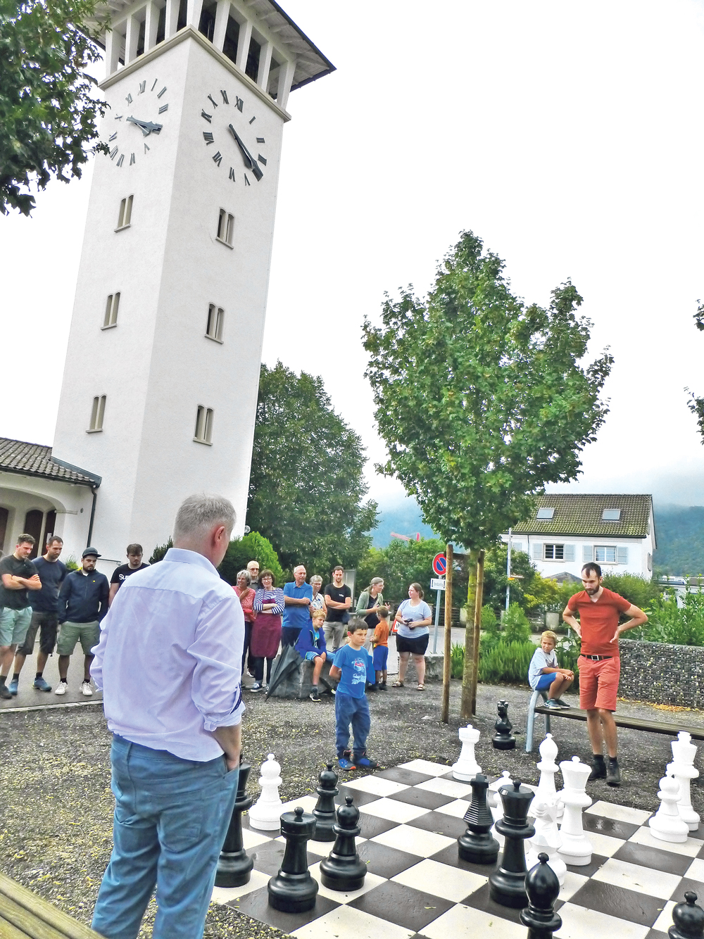 Pfarrer Martin Göbel und OK-Präsidentin Rita Bützer durchschnitten feierlich das rote Band, das den neu gestalteten Platz von der Strasse trennt. Hier, gegenüber der Pauluskirche, kann man künftig unter freiem Himmel Schach oder Pétanque spielen oder unter den Platanen ein Schwätzchen halten. Die Idee für den Platz entstand in Zusammenarbeit mit dem Verein Aktives Alter Egerkingen. «Ich hoffe», verrät Göbel, «dass hier ein Platz der Geselligkeit, Freundschaften und Austausch entsteht.» Und natürlich würde sich der Pfarrer freuen, wenn die Leute den Schritt über die Strasse in die Kirche wagten.