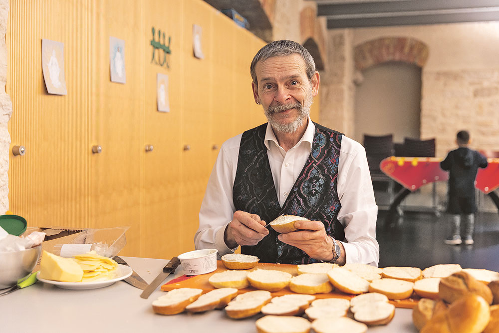 Viele Besucherinnen und Besucher sind jeden Sonntag Gast in der Matthäuskirche. Zu ihnen gehört Thierry. Er ist Metzger und hat sein Leben lang hart gearbeitet. Seit er 50 ist, kann er wegen einer chronischen Erkrankung nicht mehr arbeiten und hat deshalb kaum Geld. Als seine Freundin starb, fand er bei Thawm Mang und seinem Team des «Sonntagszimmers» Unterstützung und Halt. Seither stellt er sein Talent in der Küche jeden Sonntag zur Verfügung.