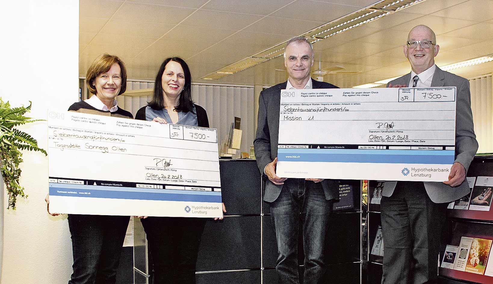 2017 sei mehr zusammengekommen als in den vorangegangenen Jahren, sagt Synodalratspräsidentin Verena Enzler anlässlich der Scheckübergabe. Im letzten September fand traditionsgemäss die Bettagskollekte statt, in der die Kantonalkirche dazu aufrief, ein Projekt im Kanton und im Ausland zu unterstützen. 2017 waren dies die Tagesstätte Olten und das Friedensprojekt Südsudan von Mission 21. Entsprechend freuten sich Luzia Stocker, Vizepräsidentin der Tagesstätte Sonnegg, und Friedrich Weibel von Mission 21 auf den Scheck von jeweils 7500 Franken.