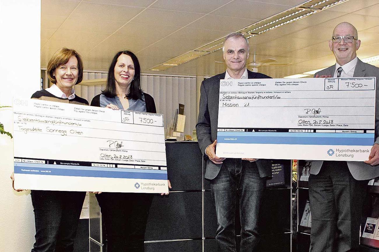 2017 sei mehr zusammengekommen als in den vorangegangenen Jahren, sagt Synodalratspräsidentin Verena Enzler anlässlich der Scheckübergabe. Im letzten September fand traditionsgemäss die Bettagskollekte statt, in der die Kantonalkirche dazu aufrief, ein Projekt im Kanton und im Ausland zu unterstützen. 2017 waren dies die Tagesstätte Olten und das Friedensprojekt Südsudan von Mission 21. Entsprechend freuten sich Luzia Stocker, Vizepräsidentin der Tagesstätte Sonnegg, und Friedrich Weibel von Mission 21 auf den Scheck von jeweils 7500 Franken.