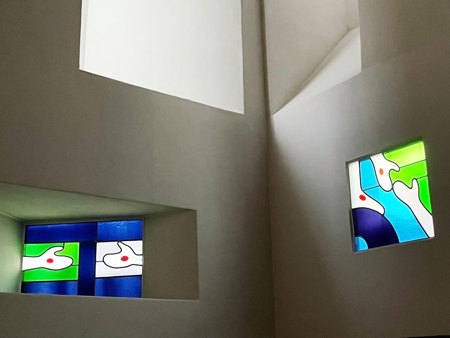 Zwölf bewusst schlicht bis naiv gehaltene Kirchenfenster verleihen dem modernen, schlohweissen Raum Atmosphäre. Das Licht, das durch die Glasfenster fällt, zieht bunte Spuren in den weissen Nischen des modernen Baus, der von Le Corbusiers Bauten inspiriert ist. Der Bilderzyklus aus zwölf Bildern des Zürcher Künstlers Max Rüedi bietet Gelegenheit, die bedeutendsten Themen des christlichen Glaubens zu meditieren – vom Paradiesbaum bis zur Vollendung im Tod.