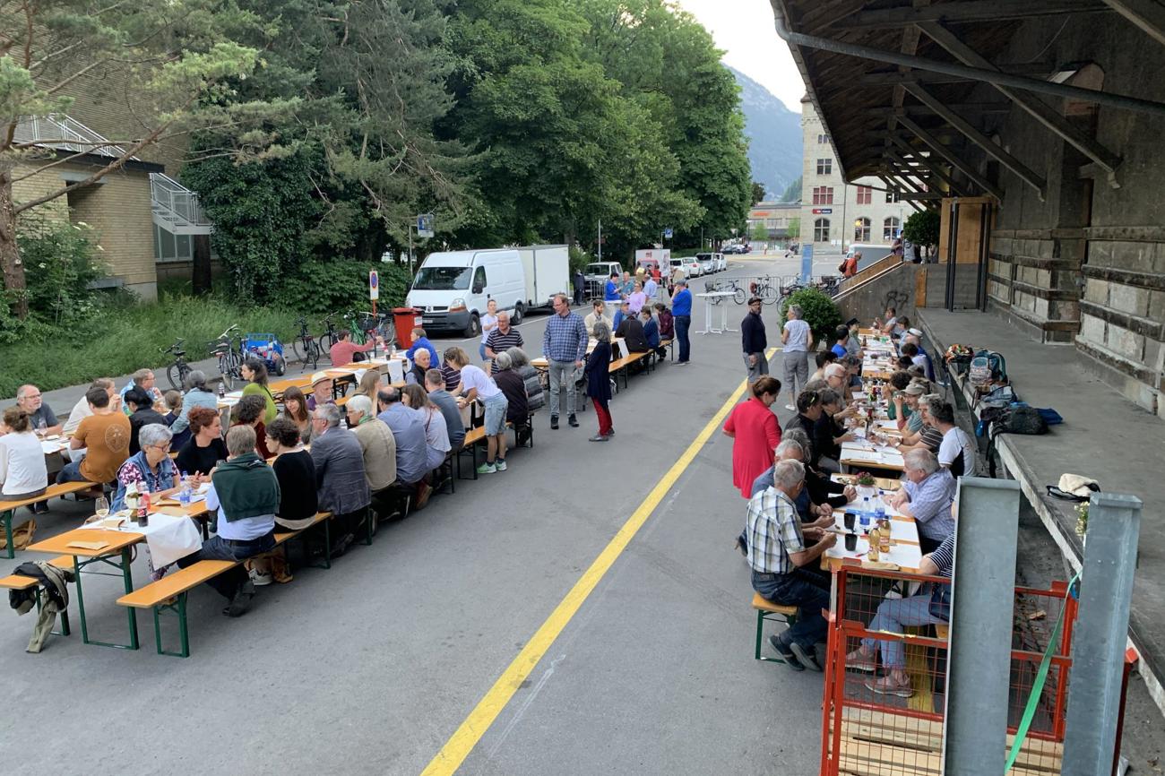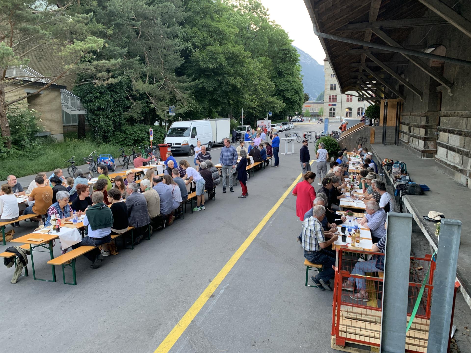 Und so verwandelte sich am Pfingstsamstag der Glarner Güterschuppen: es waren lange Tafeln gedeckt, gegessen wurde von schönem Geschirr, Palmen und dezentes Licht machten eine wunderbare Atmosphäre, die viele bei fast sommerlichen Temperaturen im Freien genossen. Die Menschen kamen miteinander ins Gespräch, während sie als Vorspeise Kürbis-Suppe oder Salat geniessen konnten, danach den Hauptgang, der aus feinem Curry mit Reis bestand, und als Nachspeise Vanille-Glacé, Apfelkuchen, Apfelmus und der obligatorische Schlagrahm. Und zwischendrin hörte man immer wieder das Erstaunen darüber, dass alles, was dort verspeist wurde, eigentlich im Müll gelandet wäre. Diskussionen darüber, wie Zuhause Lebensmittelverschwendung vermieden werden könnte. Und auch, wie Foodwaste entsteht, weil Obst und Gemüse nicht der Norm entsprechen und auf dem Feld verrotten oder die normgerechten Lebensmittel dann in den Läden zu Müll werden.