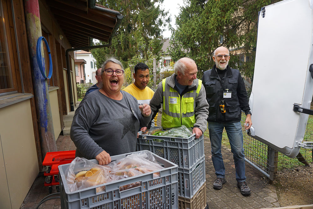 Ursi P. hält einer Frau den Korb mit den Papierzetteln hin. «Abrakadabra», ruft sie fröhlich, während die Frau einen Zettel zieht. Eine Zwölf! Ursi P. lacht. «Siehst du, mein Zauber wirkt!» Die Nummer auf dem Zettel gibt vor, in welcher Reihenfolge die Leute ihr Essen holen können. Immer vier dürfen gleichzeitig zu Edith S. und ihrem Team, um sich Gemüse, Früchte und Brot auszusuchen. Die nächste Frau hat weniger Glück. Auf ihrem Zettel prangt eine 60. Ursi P. verwirft die Arme. «Oje. Dann trinkst du eben ein bisschen Tee, bis du dran bist.»