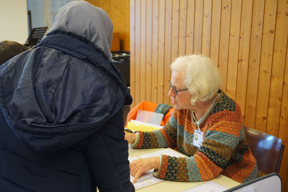 Es ist 12.30 Uhr und im Gebäude nebenan trudeln schon die ersten Bezügerinnen ein. Ursi P. hat dort den Empfang eingerichtet. Ein Holztisch, darauf eine Namenstabelle, ein Korb mit Zetteln und eine kleine Kasse für den Franken. Sie grüsst die Bezüger, wirft einen Blick auf die orangen Ausweise, die sie ihr hinhalten, und streicht die Namen auf der Liste durch.