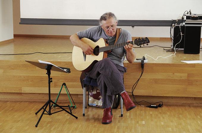 Helles Licht fällt durch die Fenster. Staub tanzt in der Luft. Vorne steht Linard Bardill, wie man ihn aus den Medien kennt: Flatternde Hose, runde John-Lennon-Brille, das störrische Haar in einem Pferdeschwanz gezähmt und als i-Tüpfelchen die roten Schuhe. Hier steht einer mitten im Leben.