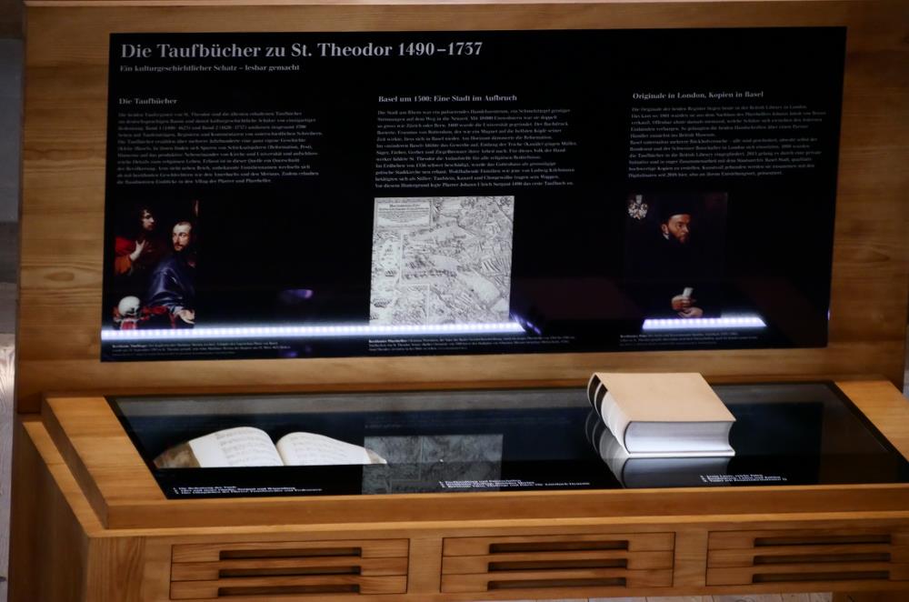 Die Vitrine mit den Taufbüchern in der St. Theodorskirche in Basel ist im Anschluss an Gottesdienste und Veranstaltungen sowie mittwochs von 12 bis 18 Uhr zu besichtigen. Führungen auf Anfrage. www.erk-bs.ch/kg/kleinbasel
