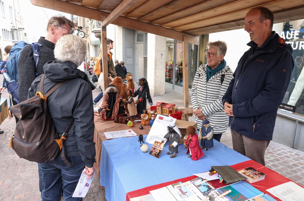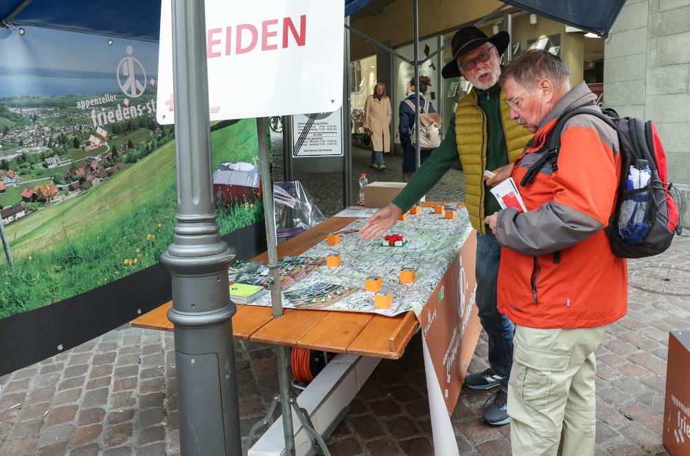 Nach der Eröffnungsfeier schlenderten die Besucherinnen und Besucher durch die Stände auf dem «Marktplatz der Hoffnung» entlang der Schaffhauser Altstadt. Es gab viel zu entdecken. Etwa den Stand von Pius Süess, Präsident der «Appenzeller Friedensstationen», der Einblicke in das Lebenswerk bedeutender Persönlichkeiten gab, die sich für den Frieden und humanitäre Ziele eingesetzt haben wie Henry Dunant, Jakob Künzler oder Gertrud Kurz.