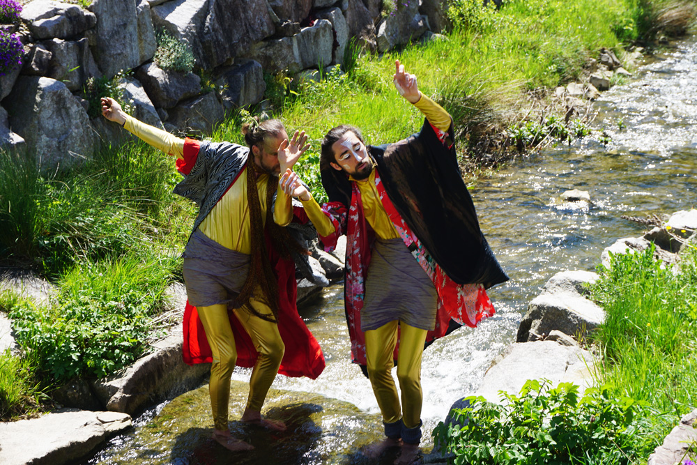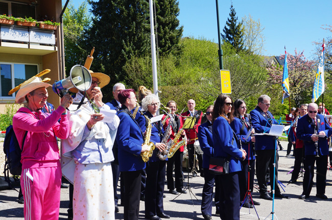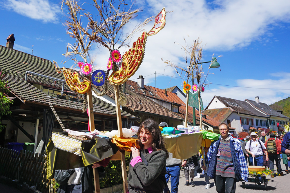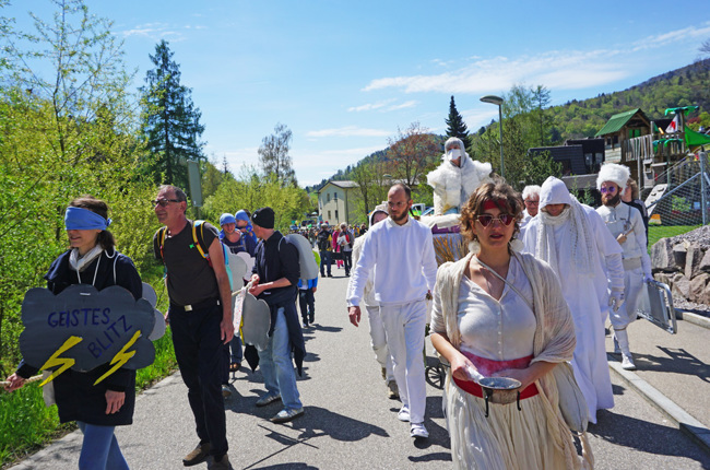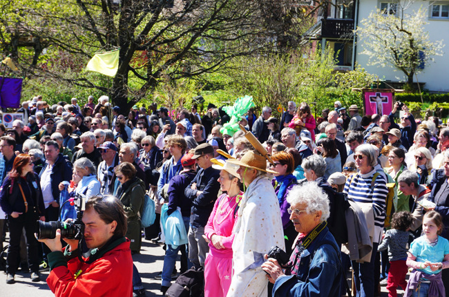 Die Pilgerstrasse war am Samstag geprägt von Performances aller Art. Es gab Konzerte aus Fenstern und von Balkonen, Auftritte der Dorfmusik und des Jodelchors und mittendrin Flashmob-Meditationen, menschliche Vögel, die aus Eiern schlüpften, und Tai-Chi-Geister im Fluss.