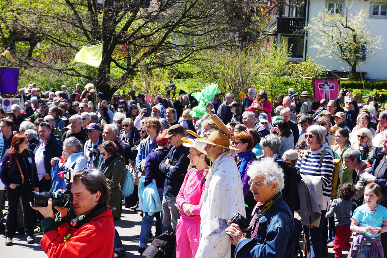 Die Musikgemeinschaft Oberdorf Waldenburg Langenbruck machte den Auftakt vor dem Gemeindehaus, dann ging die Prozession los. Und zwar langsam, denn der eilige Geist, der in uns allen wohnt, sollte ja endlich zur Ruhe kommen! Bei der Prozession handelte es sich allerdings nicht um eine herkömmliche Pilgerwanderung, sondern um eine Teigprozession: Die Teilnehmenden hatten ungebackenen Brotteig dabei, den viele gut sichtbar vor sich hertrugen oder auf einer grossen Sänfte transportierten.