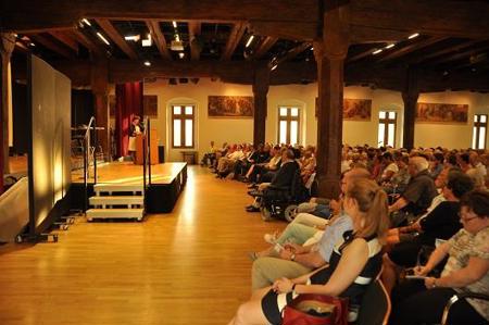 Auch die «Lerngeschichte des Dialogs», der Dialog zwischen den Religionen beachtlich. «Nur wenn wir lernende Kirche bleiben, haben wir auch Grund zu feiern.», so die Reformationsbotschafterin. Sie sprach von Luthers Sprachkraft und rief auf zu einer Erneuerung unserer eigenen Sprachfähigkeit. «Wir brauchen eine Sprache, die Menschen anrührt. Wenn wir diese Sprachkraft wiedergewinnen, können wir feiern.» Überwindung der Spaltung, Bildung und Freiheit der Bildung, das Verhältnis von Staat und Kirche sowie die Rechtfertigung allein aus Gnade, die gerade heute aktuell sei, und schließlich die Weitergabe der guten Botschaft mittels einer guten Nutzung der Möglichkeiten im Medienzeitalter waren weitere Themen, an denen sie anschaulich und begreiflich machte, welche großen Schätze die Reformation unserer Gesellschaft hinterlassen hat und mit denen sie sie heute noch bereichern kann.