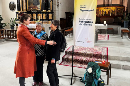 Nebenan in der Franziskanerkirche konnten Pilgerinnen und Pilger, die das wünschten, einen individuellen Pilgersegen für die kommende Pilgersaison empfangen. Möglich machten dies zwei Vertreter aus St. Gallen: In feierlichem Rahmen gingen die Pilgerseelsorgerin Ines Schaberger und ein Mitglied des Vorstands der St. Galler Pilgerherberge, Thomas Schubiger, in ihren Segenssprüchen auf die persönlichen Anliegen der Pilgerinnen und Pilger ein. Zum Mittagessen wurden die Besucherinnen und Besucher draussen in beheizten Zelten mit Pilgersuppe und spanischem Mandelkuchen verköstigt.