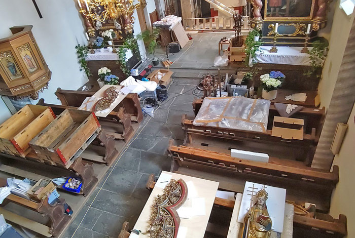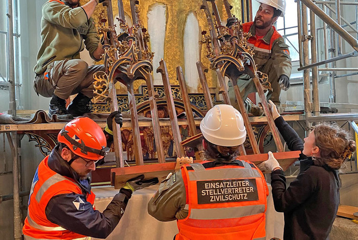 Es war eine Hauruckaktion. Obwohl die Evakuierung schon länger Thema war. Im Herbst 2021 wurden wir bereits vom Leiter der Denkmalpflege, Simon Berger, angefragt, ob wir eine vorsorgliche Evakuierung durchführen könnten. Damals gab es ein Treffen mit Denkmalpflege, Kirchgemeinde und Dorfgemeinde. Die Dorfbevölkerung bat damals darum, den Altar so lange wie möglich in der Kirche zu belassen. Für die Gläubigen ist das Retabel ja nicht nur ein Kulturgut, sondern imminent wichtig zur Glaubensausübung und für das tägliche Leben. Diesem Wunsch kam der Denkmalschutz nach – zumal es Phasen gab, in denen sich das Abrutschen des Berges verlangsamte. Eine Evakuierung schien nicht mehr so akut. Unabhängig davon schauten wir uns damals aber den Altar schon genauer an, machten hochauflösende Fotoaufnahmen und Konservierungstests, denn wir sollten ihn im Juli/August dieses Jahres auch in der Kirche noch restaurieren.