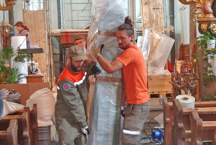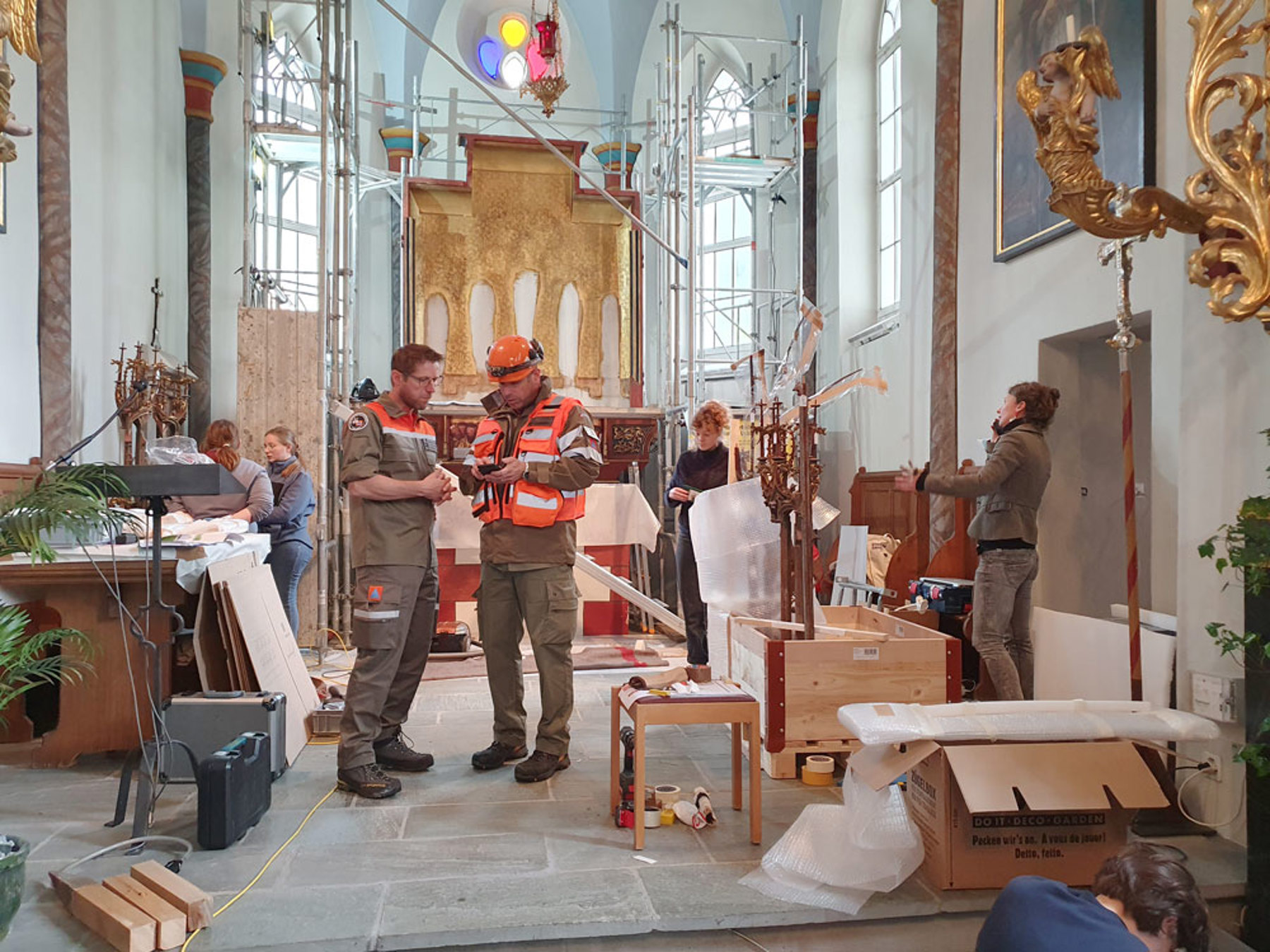 Uns wurde gesagt, es brauche mehrere Wochen, um die Orgel rauszunehmen und sie würde Schaden nehmen, bei einem Ausbau. Deshalb haben Studierende sie auf Wunsche des Denkmalpflegers sehr genau fotografisch dokumentiert. Nach Ende nahmen die Feuerwehr und der Bündner Kulturgüterschutz noch Bilder aus schwindelerregender Höhe ab, die etwa mit nur einem Nagel an der Wand befestigt waren und die bei grösseren Erschütterungen heruntergefallen wären. Statuen wurden etwa so gestellt, dass sie auf einer grösseren Fläche standen.