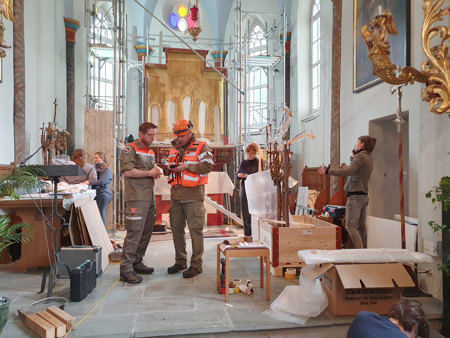 Beeindruckt hat mich die Solidarität, die wir und auch die Kirchgemeinde erfuhren. In enorm kurzer Zeit wurde sehr viel auf die Beine gestellt. Der Denkmalpfleger, der Kulturgüterschutz und nicht zu vergessen die Gerüstbaufirma waren immer sofort zur Stelle. Die Nachbargemeinden halfen dabei, einen Lagerort in der Nähe zu finden. Vom Rätischen Museum wurden uns Luftbefeuchter geliehen, damit auch das Klima am neuen Ort stimmt. Viele Kollegen aus der Hochschule wären ebenfalls bereit gewesen zu helfen, wenn zum Beispiel der Kulturgüterschutz nicht hätte kommen können. Und wir wurden sehr gut von der Kirchgemeinde versorgt, mit Brötchen, Kuchen, Pizza und Kaffee. Sie haben sich sehr gefreut, dass wir es noch vor der roten Phase geschafft haben, das Retabel geordnet rauszubringen.