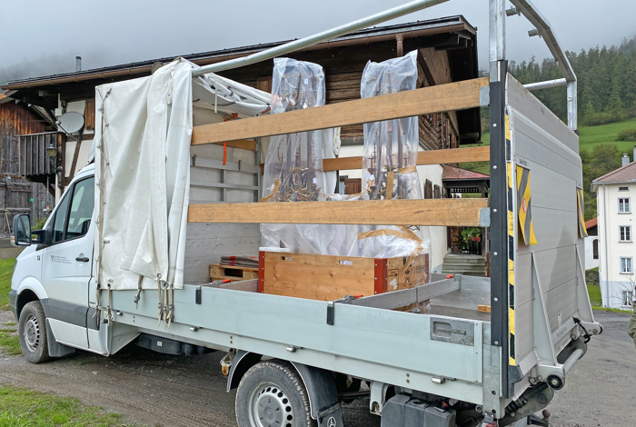 Die einzelnen Pakete mussten ins Transportfahrzeug passen, daran haben wir uns orientiert. Insgesamt haben wir sicher über 100 Teile eingelagert. Manche Teile konnten wir nicht auseinandernehmen, weil sie verleimt waren oder die verrosteten Schrauben und Nägel nicht schnell zu lösen waren. Ein Teil war zehn Zentimeter zu gross für das Transportfahrzeug. Also nahmen wir die Plane ab, der Altar war ja wasserdicht verpackt. Und der Kulturgüterschutz fuhr ganz vorsichtig, wählte die Strassen mit dem besten Belag, bemühte sich, Schlaglöcher zu vermeiden. Der Ort für die Einlagerung wurde auch in der Nähe gewählt, sprich, im Albulatal. Je kürzer der Weg, desto besser.