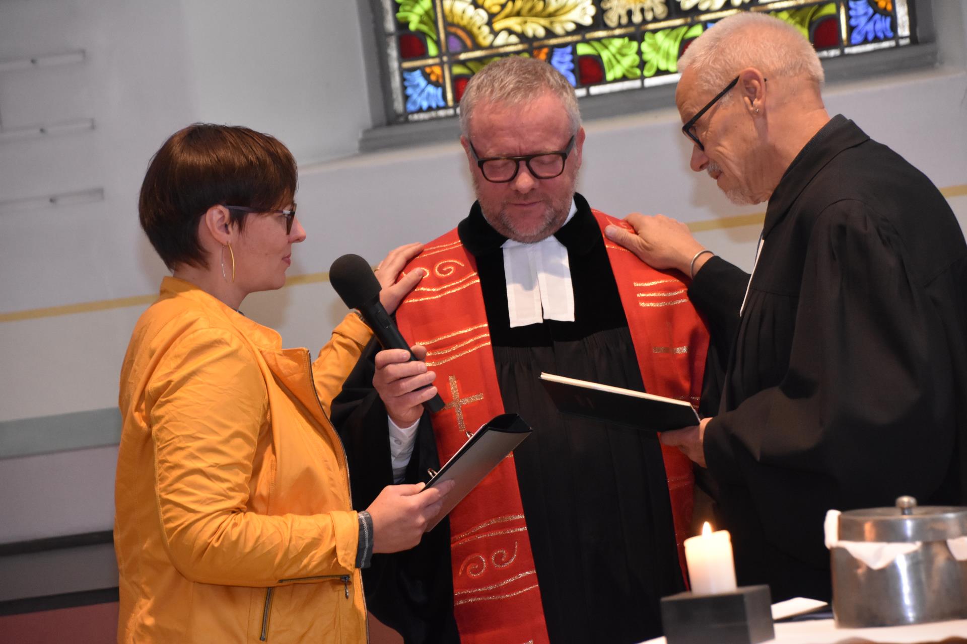 Wie Apostel Paulus einst den Korinthern wünscht Koni Bruderer dem Walzenhauser Pfarrer: „Vergiss nie den Auftrag zur Freude.“ Die Gemeinde rief er auf, den Pfarrer zu achten und zu schätzen. Klaus Stahlberger habe seine Arbeit in den Worten „Freude im Glauben, Arbeite für die Liebe, Wiederstand für die Hoffnung“ treffend zusammengefasst. Nach der offiziellen Amtseinsetzung segneten Kollegin Martina Tapernoux und Koni Bruderer Klaus Stahlberger. Danach bekannten sich Kirchenvorsteherschaft und Gemeinde zu ihrem Dorfpfarrer.