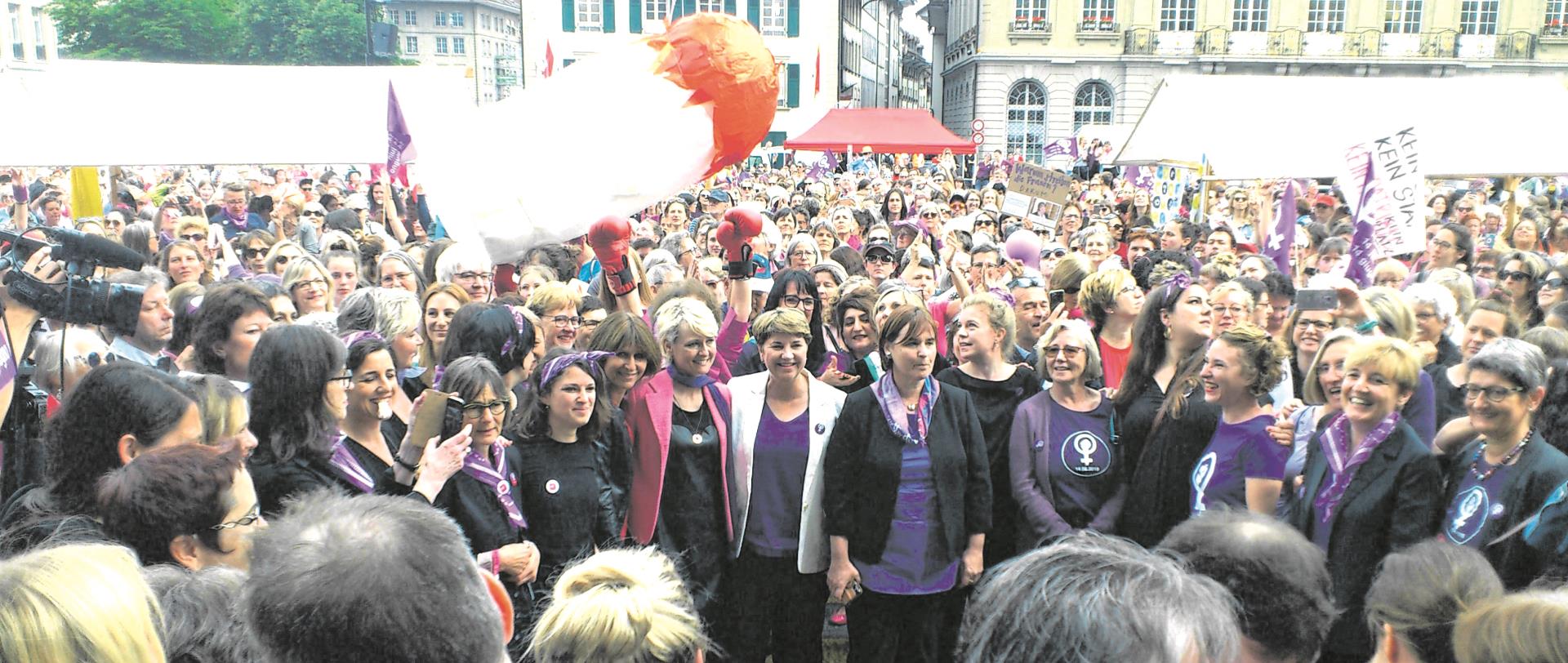 ner und ganze Familien – überwältigend. Die Stimmung ist locker, die Forderungen jedoch lautstark. Von den Reden verstehen wir kein Wort, lassen uns aber gerne von Nationalrat Matthias Aebischer den pinken Streiksirup ausschenken. Und geraten kurz in Aufregung, als sich Bundesrätin Simonetta Sommaruga unter die Demonstrierenden mischt.
