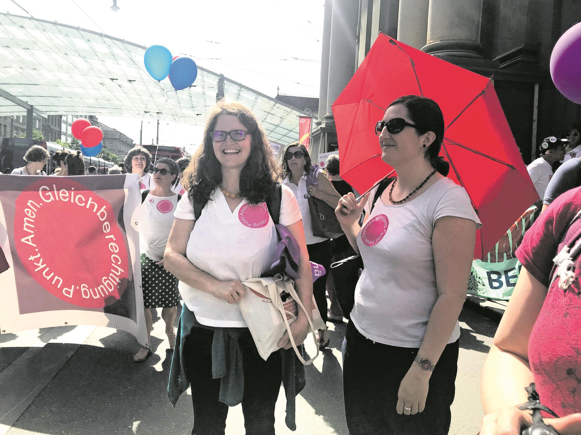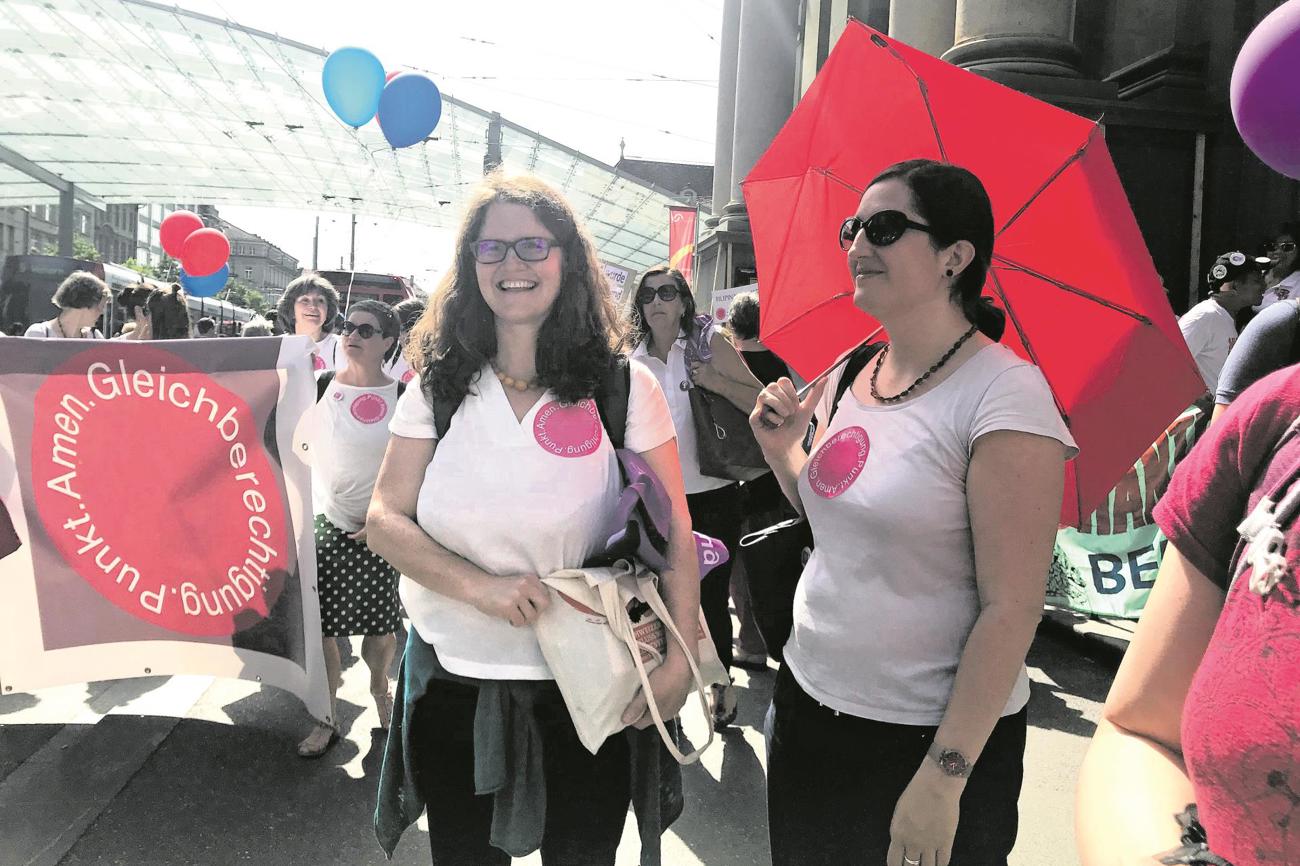 An diesem Slogan ist etwas falsch. Das merke ich, bevor ich ihn zu Ende gedacht habe. «Gleichberechtigung. Punkt. Amen.», muss es heissen. Dies ist das Motto der streikenden Kirchenfrauen. Mit einigen von ihnen habe ich mich zum Streiken verabredet. Ich stänkere also noch etwas herum, mache mich dann aber doch auf nach Bern, wo ich am Nachmittag mit Gabriela Allemann, der frisch gewählten Präsidentin der Evangelischen Frauen Schweiz EFS, am Demonstrationszug teilnehme. Ebenfalls auf der Strasse: Barbara Fankhauser und Christine Volet vom EFS-Zentralvorstand. Wir kleben uns den gut sichtbaren pinken Punkt mit dem Streikmotto auf Brust und Rücken.