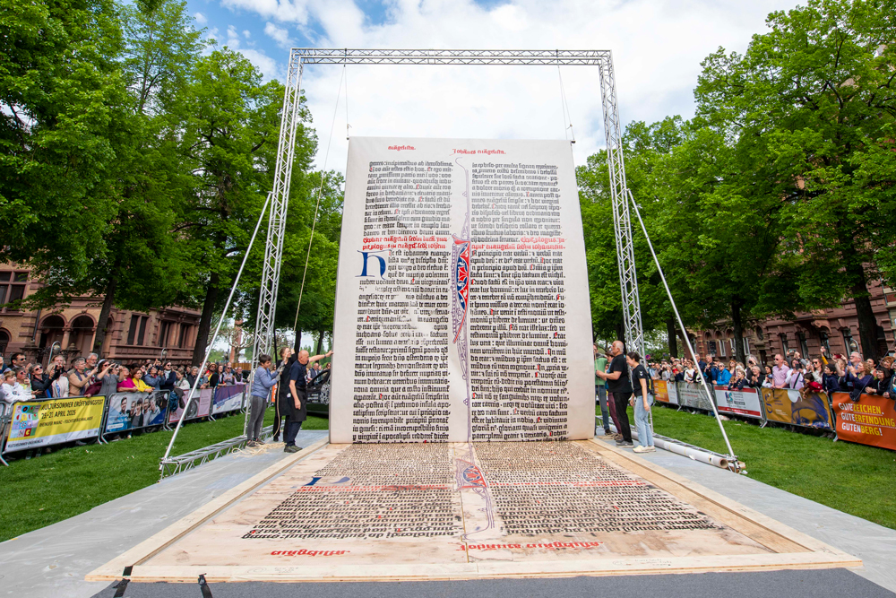 Insgesamt dauerte der Druck der Seite vom Einfärben der Buchstaben bis zum Aufrichten der fertigen Seite fast drei Stunden. Hunderte Schaulustige begleiteten das Spektakel am Mainzer Rheinufer. Für Sonntag war die Anfertigung einer zweiten grossformatigen Bibelseite geplant, bei der die Festbesucher mit ihrem Körpergewicht die Druckerpresse ersetzen sollen.