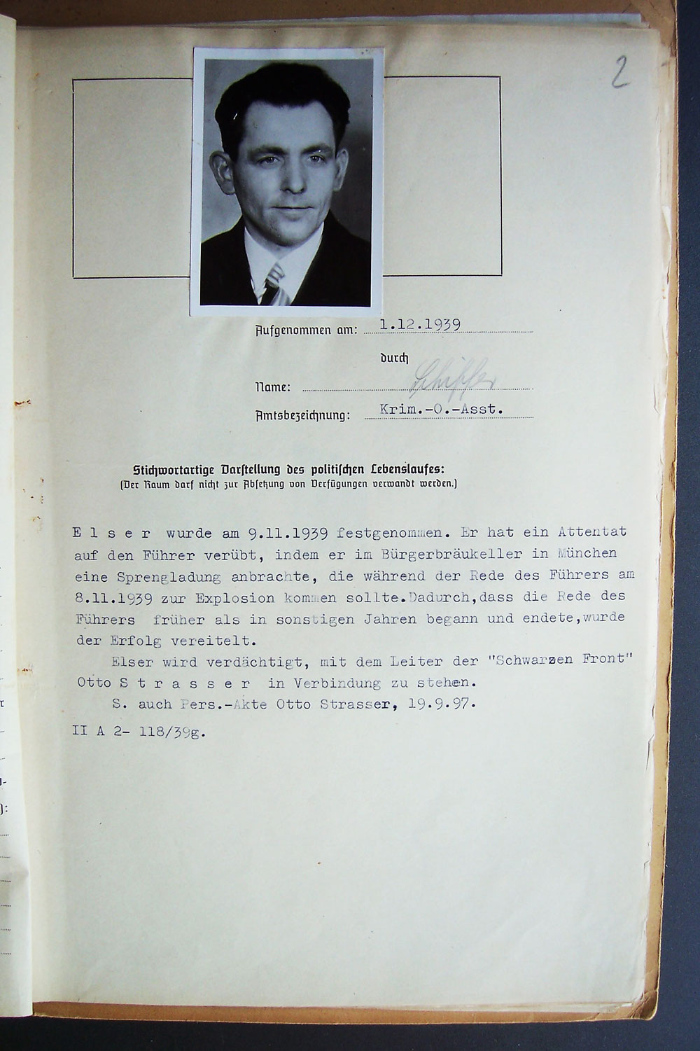 Georg Elser (1903–1945) sass seit dem 8. November 1938 im Gefängnis. An diesem Tag hatte der Schreinergeselle aus dem schwäbischen Königsbronn versucht, Hitler zu töten. Er hatte eine Bombe im Münchner Bürgerbräukeller präpariert, wo Hitler eine Rede halten sollte. Aber der Diktator verliess das Lokal früher als geplant. Die Bombe, die Elser dort versteckt hatte, explodierte daher 13 Minuten zu spät. Elser handelte völlig allein und hauptsächlich aus moralischen Gründen. Er sah voraus, dass Hitler Krieg wollte. Mit seiner Tat habe er «ein noch grösseres Blutvergiessen verhindern» wollen, gab er später beim Verhör durch die Gestapo zu Protokoll.