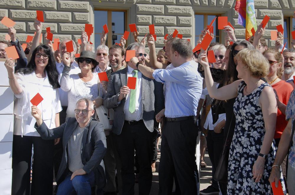 Eine eindrückliche Menge von Menschen versammelte sicham 24. Juni unter strahlender Sommersonne auf der Bundesterrasse: Mehr als 300 Personen sollen bei der Einreichung der «Korrektur-Initiative» dabeigewesen sein, teilt die Allianz gegen Waffenexporte in Bürgerkriegsländer mit. Die Anwesenden zeigten den Befürwortern der kritisierten Exporte symbolisch die rote Karte. Die Initiative wurde mit 134'000 Unterschriften ein ganzes Jahr vor Ende der Sammelfrist eingereicht.