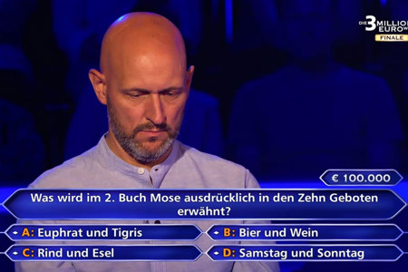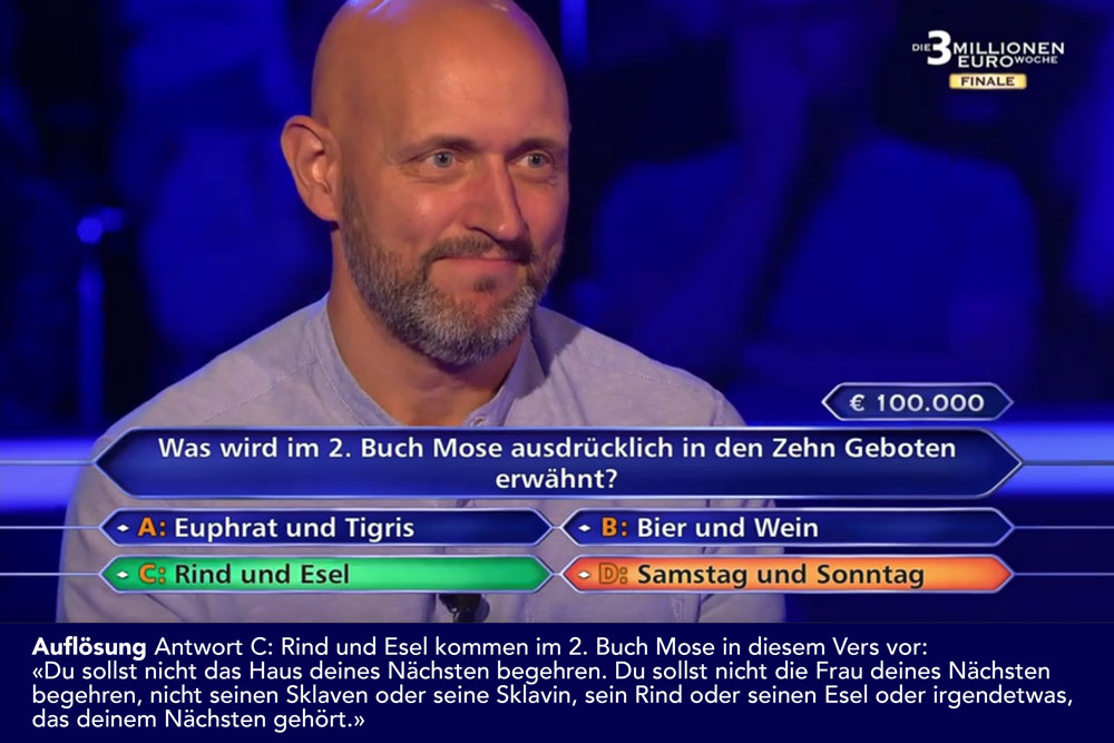 Aber bei der 100'000-Euro-Frage ging es dann doch schief: Die folgende Religionsfrage wurde Holger Rohm zum Verhängnis: «Was wird im 2. Buch Mose ausdrücklich in den Zehn Geboten erwähnt?» Der Kandidat tippte falsch und musste am Ende mit 11'000 Euro statt der sicher geglaubten 64`000 Euro nach Hause gehen.