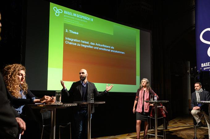 Anhand von Mansours Thesen diskutierte «Basel im Gespräch» über die Integration. Das Besondere war, dass alle Politikerinnen und Politiker auf dem Podium und selbst der Moderator Frank Lorenz, der aus Deutschland stammt, Migrationshintergrund haben. Sibel Arslan, Basler Nationalrätin der Grünen, kam mit elf Jahren aus der Türkei in die Schweiz. Ihre Integration geschah «schleichend» in der Schule, «dann wurde ich überfahren und bin heute integriert», erklärte die Juristin.
