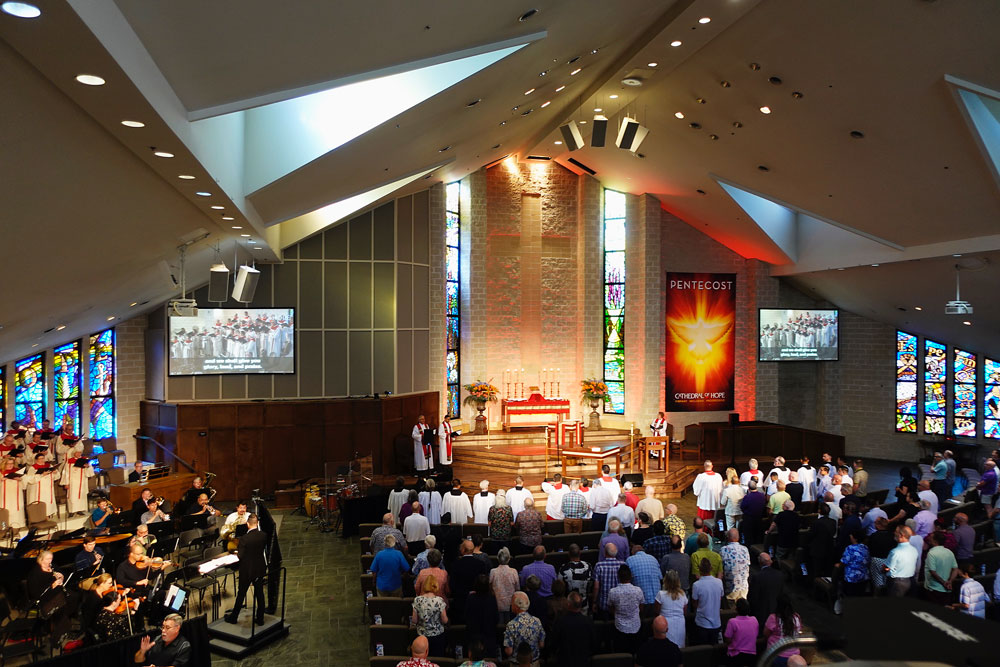 In diesem politisch aufgeladenen Klima wird Sicherheit grossgeschrieben. Beim Eingang zur Kirche steht ein bewaffneter Sicherheitsbeamter mit Cowboyhut. Der Weg führt an einem Souvenirladen vorbei, wo, ganz amerikanisch, Tassen, Trinkflaschen, Hüte und T-Shirts mit dem Regenbogen-Symbol angeboten werden. Der moderne Kirchenraum strahlt Wärme und Akzeptanz aus. In den farbigen Glasfenstern sind die Gender-Symbole und das Wort «Hoffnung» zu erkennen.