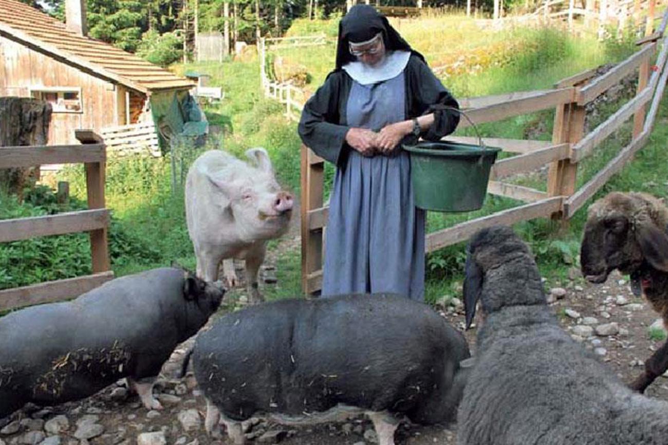 Seit 2005 lebt Schwester Theresia auf dem «Felsentor». Hier im Seminar- und Meditationszentrum am Rigi kümmert sie sich um die Tiere, die auf dem Gnadenhof leben. Frei flattern die Hühner herum, zufrieden suhlen sich die Schweine im Matsch und auf den Matten grasen die Schafe, Ziegen und Kühe.
