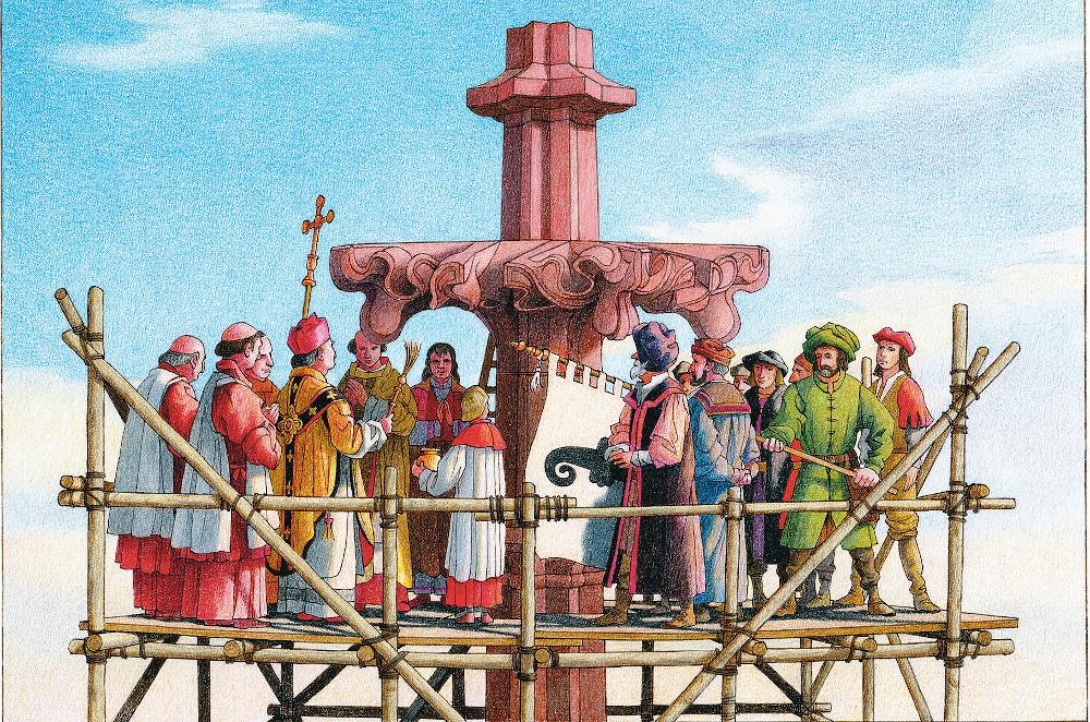 Auf der Grundlage historischer Fakten und gestützt auf umfangreiche Recherchen entwirft Stephan Jon Tramèr ein reichhaltiges Bild des ausgehenden Mittelalters. Um die historische Plausibilität von Text und Bildern zu gewährleisten, zog der Autor u. a. den Mentalitätshistoriker Claudius Sieber-Lehmann sowie die Kunsthistorikerin und Münsterautorin Dorothea Schwinn Schürmann zu Rate. «Die Textpassagen, die das Handwerk der Steinmetze betreffen, prüfte Marcial Lopez, vormaliger Meister der Basler Münsterbauhütte. «In der Reihe der Münsterliteratur stelle das Buch einen hervorragenden Beitrag dar, schreibt Münsterbaumeister Andreas Hindemann. Erstmals würden in zeichnerischen Darstellungen wissenschaftlich erarbeitete Befunde zur Polychromie, der Mehrfarbigkeit des Basler Münsters, in derart umfassender Weise zur Kenntnis gebracht.