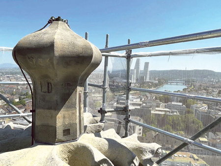 Das bis zur Turmspitze hinaufragende Gerüst gelte wohl als das derzeit spektakulärste in Basel. «Speziell angefertigte Stahlbauteile zur Übernahme von Windkräften – angebracht an der intakten Baumasse im Bereich des Uhrengeschosses – halten das frei auskragende Gerüst des Turmhelms», erklärt Andreas Hindemann. Diese Abspannung müsse pro Turmseite Zugspannungen von bis zu 56 Tonnen aufnehmen können und Windgeschwindigkeiten von über 100 Stundenkilometern standhalten. Um die Angriffsfläche für Windkräfte auf Gerüst und Baumasse möglichst tief zu halten, würden die Gerüstnetze jeweils in den Wintermonaten abgenommen. «Erfahrungsgemäss wüten dann die stärksten Stürme.»