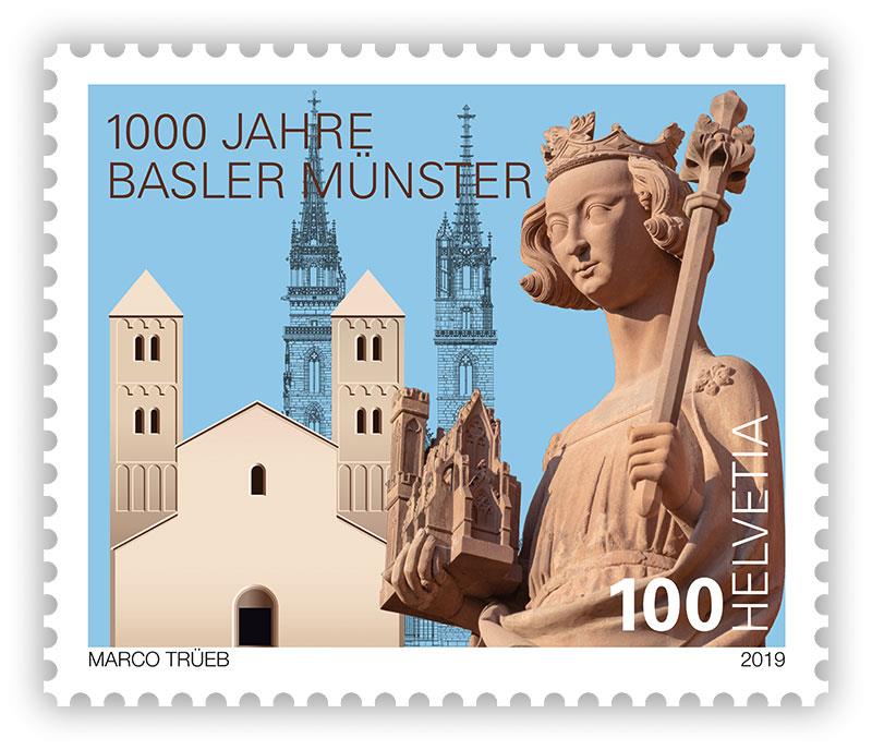Die leuchtend blaue Marke für das Münster zeigt die Statue von Kaiser Heinrich II. vor der Rekonstruktion der romanischen Fassade, im Hintergrund die gotischen Türme des Münsters, wie sie bis heute das Stadtbild von Basel prägen: Tausend Jahre Baugeschichte auf zwei mal drei Zentimetern. «Die Sondermarke zum Münster ist schön», bemerkte Post-Verwaltungsratspräsident Urs Schwaller bei der Vorstellung in Basel und erinnerte daran, dass sich die Menschen vor der Erfindung der Post auf zentralen Plätzen wie dem Münsterplatz trafen und bis heute die Kirchenglocken der Kommunikation dienen. Er hoffe, dass viele Menschen die Sonderbriefmarke zum Anlass nehmen, das Basler Münster wieder einmal zu besuchen.