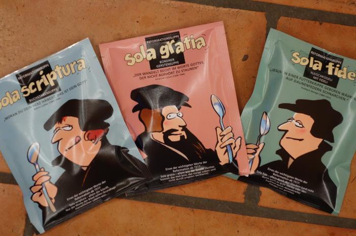 Zu intellektuell sei das Reformationsjubiläum. Deshalb bringen Heinz Wulf und Karolina Huber 37'000 Tütensuppen mit dem Konterfei der Reformatoren unters Volk. Die Buchstabensuppe als humorvolle reformatorische Botschaft.