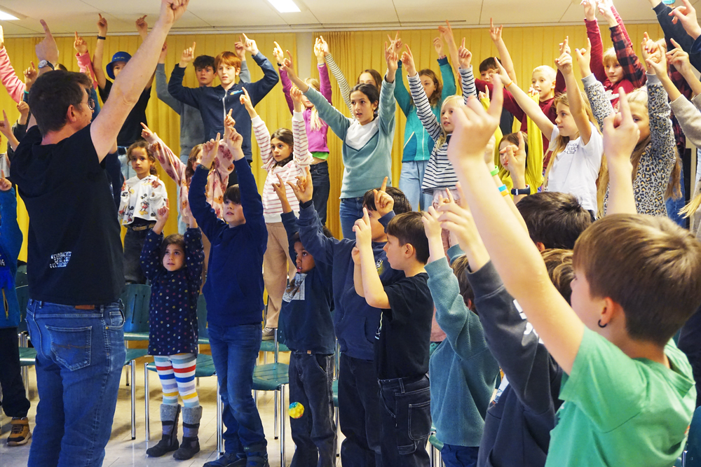 Man hört sie schon zwei Strassen weiter, wenn man sich am Mittwochnachmittag dem reformierten Kirchgemeindehaus Gelterkinden nähert. Aus 46 Kinderkehlen donnert es: «Maria! Mueter vo Jesus, userwäält und gleitet vo Gott.» Die Kinder stehen in drei Reihen auf ihren Stühlen. Passend zum Liedtext machen sie Handbewegungen. Chorleiter Andi Grossmann läuft vor ihnen auf und ab, dirigiert mit grossen Gesten und hebt den Liedtext gross ausgedruckt auf A4-Blättern in die Luft.