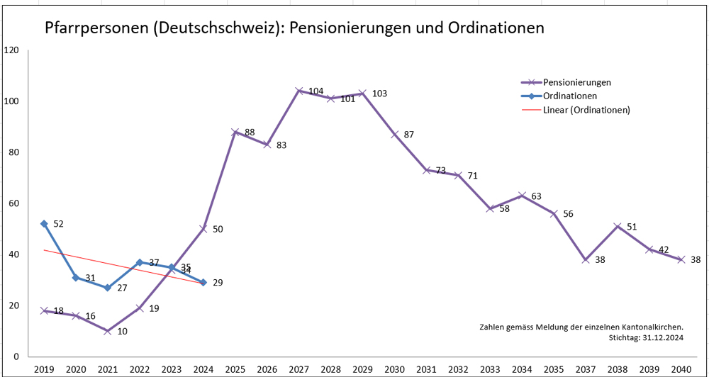 Die reformierte Landeskirche steht am Beginn einer grossen Pensionierungswelle der Babyboomer-Generation. Zwischen 2027 und 2030 werden jährlich etwa 100 Pfarrpersonen in den Ruhestand gehen. Ab 2040 wird die Zahl der Pensionierungen und Ordinationen bei etwa 30 pro Jahr liegen. Der Grossteil der Pensionierungen betrifft Männer in Vollzeitstellen, was den steigenden Frauenanteil im Pfarrberuf erklärt.