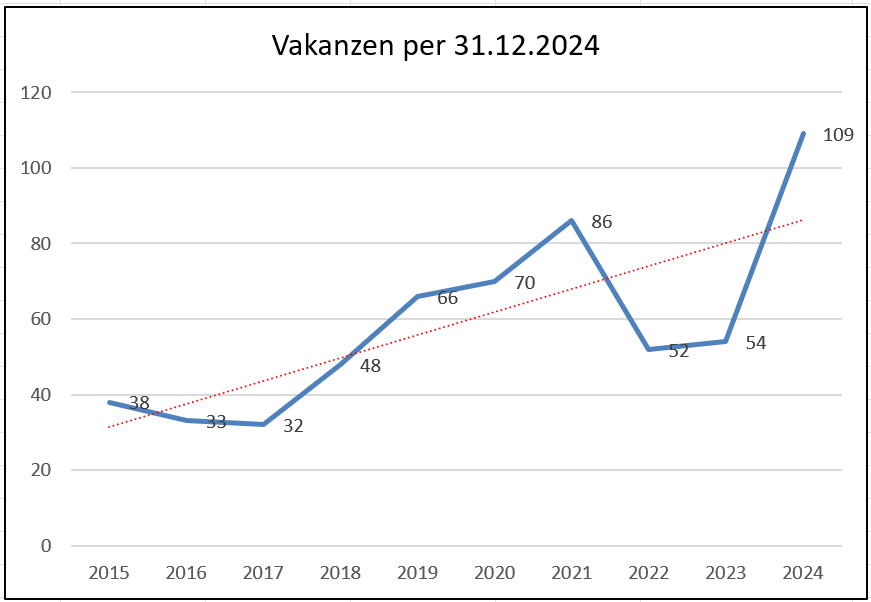2024 wurde ein Rekord bei vakanten Pfarrstellen erreicht: Ende letzten Jahres meldeten die Kantonalkirchen 109 offene Stellen, doppelt so viele wie im Vorjahr und dreimal so viele wie vor zehn Jahren. Angaben zur Art der vakanten Stellen fehlen.