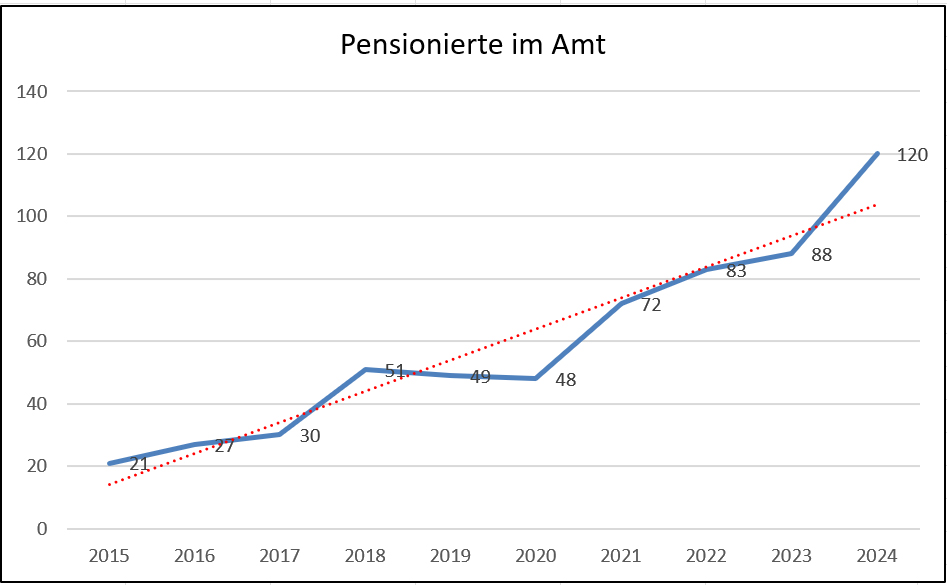 Aktuell arbeiten 120 Pfarrpersonen über das reguläre Rentenalter hinaus, ein Drittel mehr als im Vorjahr. Von 47 pensionierungsberechtigten Pfarrpersonen traten nur 38 in den Ruhestand, 23% arbeiten weiterhin. Dies könnte am Bewusstsein für den Nachwuchsmangel und an attraktiveren Arbeitsbedingungen im Pensionsalter liegen.
