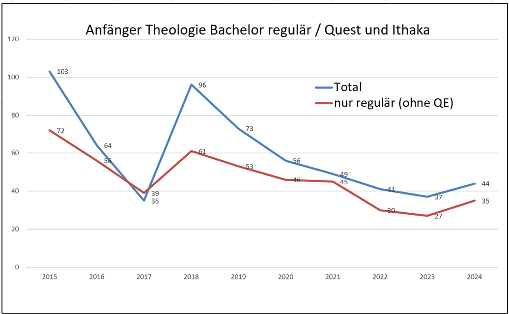 Die Zahl der Theologiestudierenden stieg im Vergleich zum Vorjahr um 18% (7 Personen). Dennoch sind es weniger als die Hälfte der Einschreibungen von vor neun Jahren. Der Anteil der Quereinsteiger:innen schwankt, in den letzten fünf Jahren lag er durchschnittlich bei 20%, mit jährlichen Schwankungen zwischen 9% und 30%.