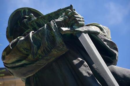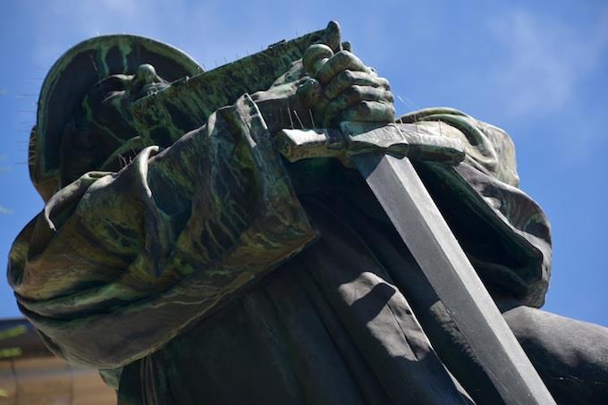 Was aber die Geschichten um Zwinglis Schwert allesamt eint: Sie sind aufgeladen von dem sich wandelnden Zwinglibild. Bester Ausdruck davon ist das vom Tiroler Heinrich Natter gestaltete eherne Standbild hinter der Zürcher Wasserkirche. Dort wird Zwingli monumental das Schwert in die Hand gedrückt. Der katholische Bildhauer stellte den Zürcher Reformator als patriotisch-politischen Helden auf den Denkmalsockel. Erst nach langem Ringen der Denkmal-Kommission hielt der Gusseisen-Zwingli schliesslich noch die Bibel in der anderen Hand. Bei der Einweihung des Denkmals dichtete damals Conrad F. Meyer: