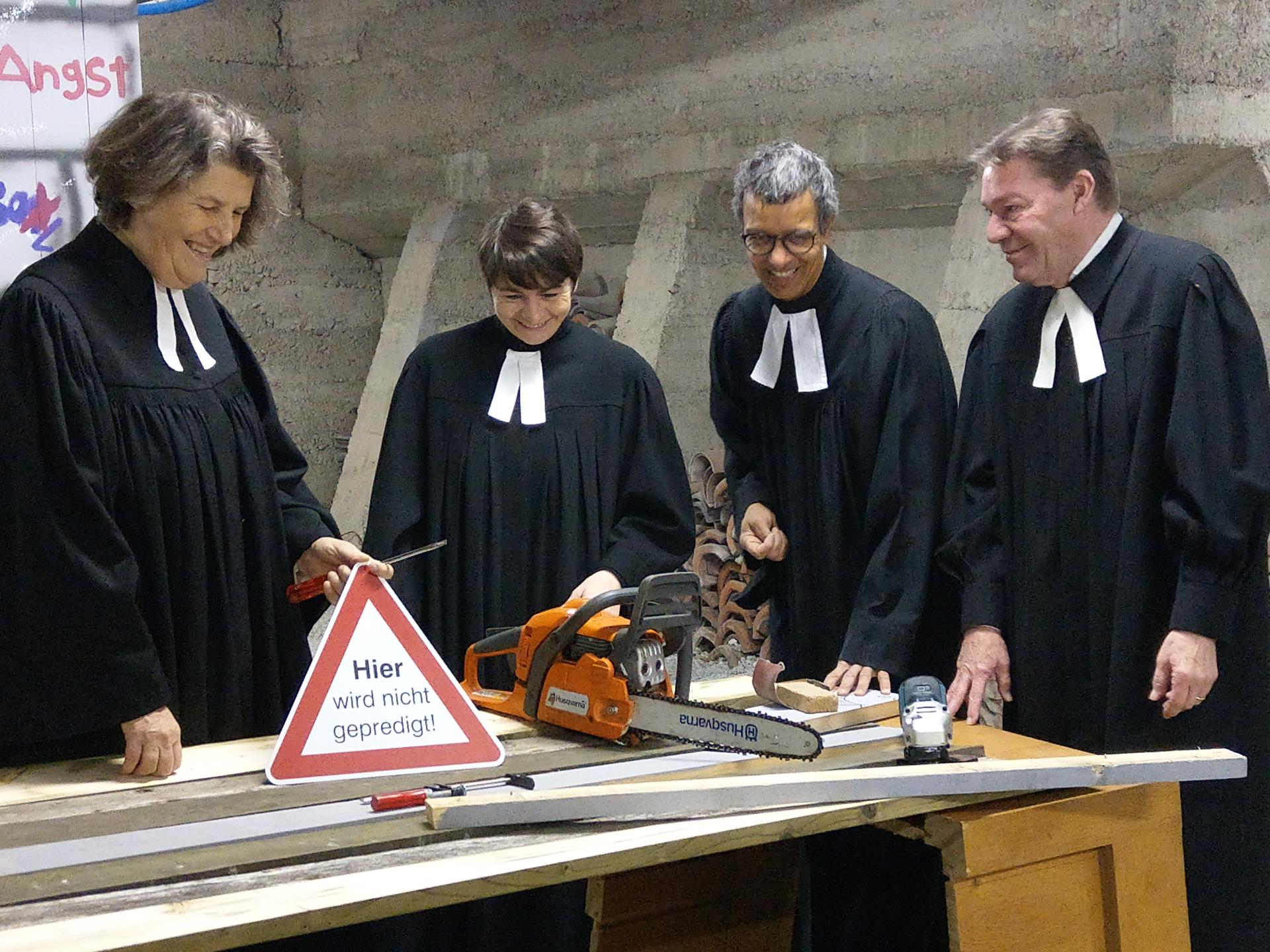 Im Übrigen ist es kein Zufall, dass Kathrin Bolt für das Projekt «predigtfreie Gottesdienste» ausgerechnet zur Motorsäge griff. Die Pfarrerin wurde auf Facebook nämlich für die so genannte «Motorsägen-Challenge» nominiert, welche die Konzeptkünstler Frank und Patrik Riklin lancierten. Die Aufgabe war, mit einer Motorsäge ein Stück Realität herauszuschneiden und in einem neuen Kontext zusammenzusetzen. «Dafür eignete sich die Kanzel perfekt», sagt Bolt.