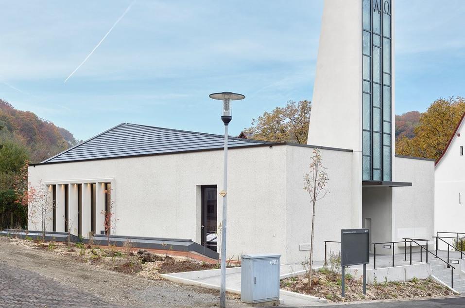 Die Installation einer Photovoltaikanlage war im Bauprogramm vorgegeben. Damit konnte dieses Thema bereits im Entwurfsprozess mitgedacht werden. Andreas Hindemann als verantwortlicher Architekt und die Baukommission legten grossen Wert auf eine optimale Integration der Solaranlage. So präsentiert sich das dreiteilige Dach in einer Kombination von PV-Modulen und farbgleichen Faserzementplatten. «Eigentlich sollte heute jeder Kirchenneubau eine Plus-Energie-Kirche sein», ist Andreas Hindemann mittlerweile überzeugt. «Auch ästhetisch ist das heute gut machbar. Die historischen Kirchenbauten sind da jedoch auszunehmen, denn selbst in der Innerstadt bieten sich noch viele vorhandene Flachdächer an, die mit Solar- oder Photovoltaikanlagen ausgerüstet werden können.»